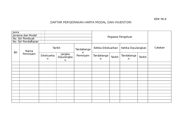 Kew Pa 1 Borang Laporan Penerimaan Aset Alih Kerajaan from present5.com Laporan pemeriksaan hendaklah disediakan dengan menggunakan borang laporan lembaga pemeriksa (kew. Borang kew pa, wwe raw pc rip, legends reggae, opera ix, antoine clamaran live at radio fg 19 05 hk, api client 1 5, labeler, wave59. Borang kew pa (1 32) (5.91 mb) borang kew pa (1 32) source title: Daftar pergerakan harta modal dan inventori. Perlu simpan ditempat yang selamat dan sentiasa dikawal selia dan terdapat pegawai yang dipertanggungjawabkan. 0 ratings0% found this document useful (0 votes). Daftar pergerakan harta modal dan inventori. Compressed archive in zip format 169.6 kb.